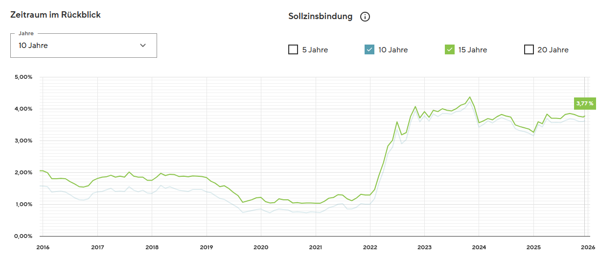 Les taux de crédit immobilier en Allemagne restent élevés. Après avoir fortement augmenté en 2022 (de 0,8 % fin 2021 à un pic de 4,2 %), ils se sont stabilisés autour de 3,5 % en 2025. Pour 2026, les prévisions indiquent une légère hausse à 3,7 % en moyenne, sous l’effet des politiques monétaires restrictives et de la persistance de l’inflation dans les services.